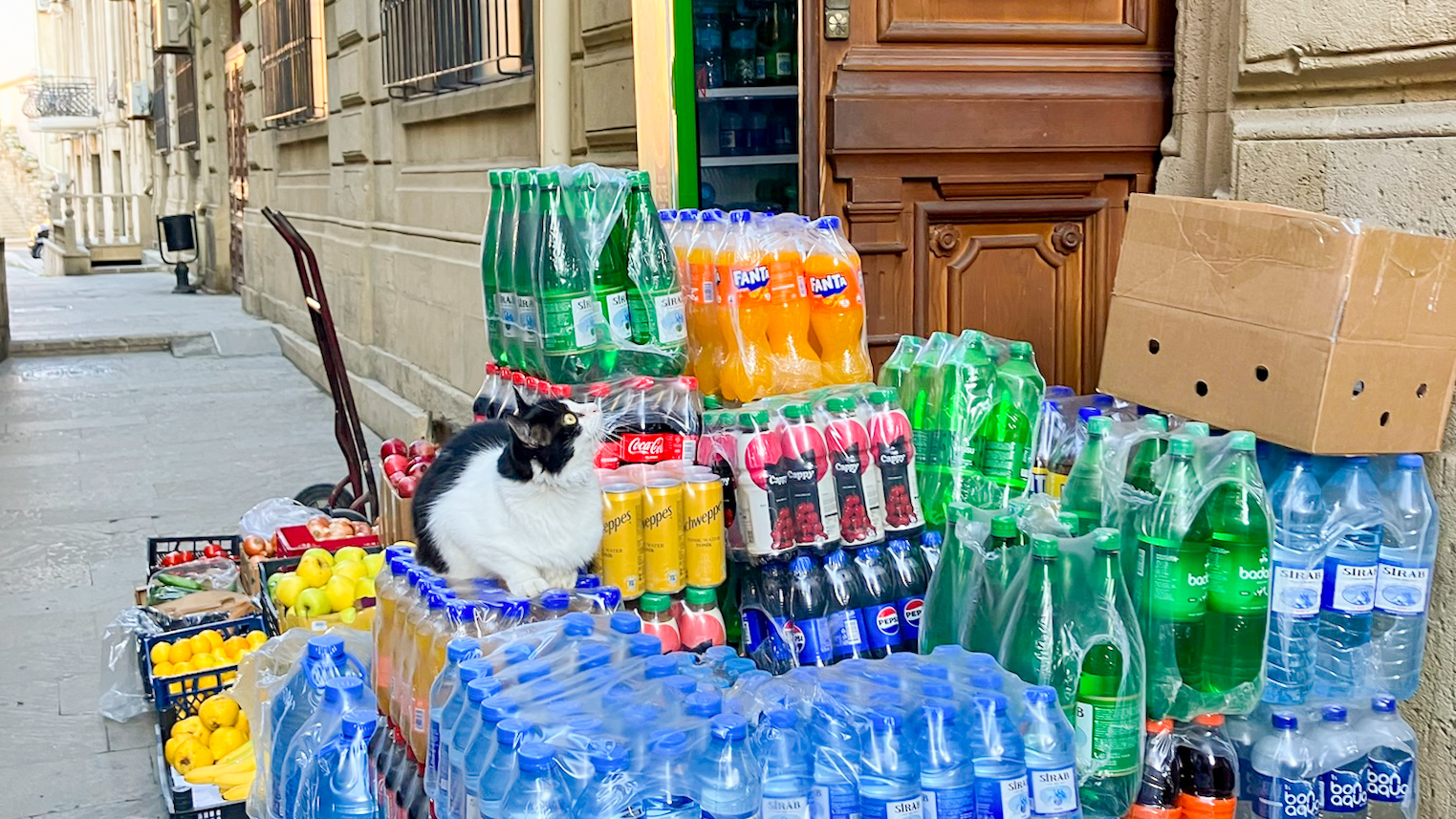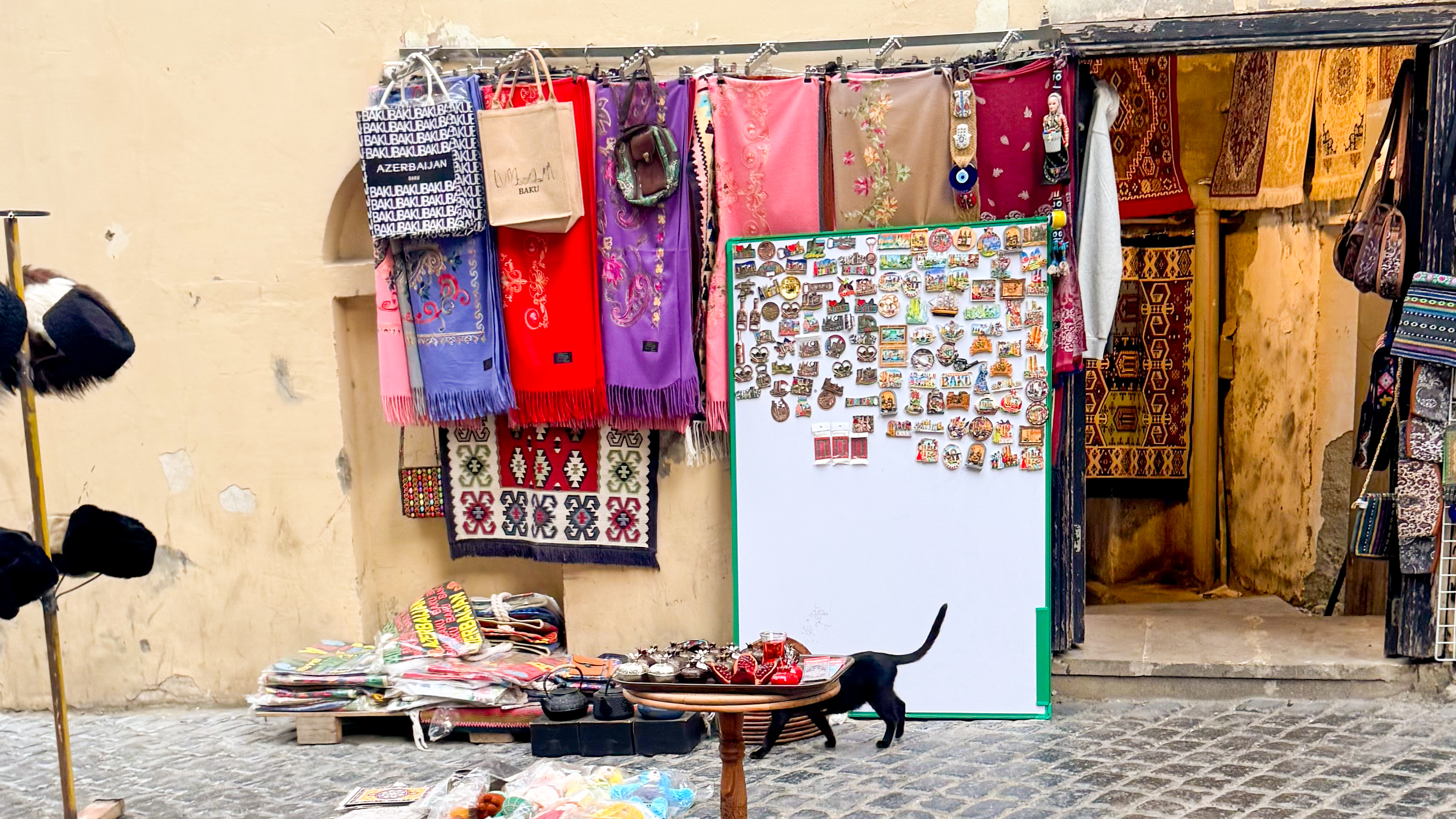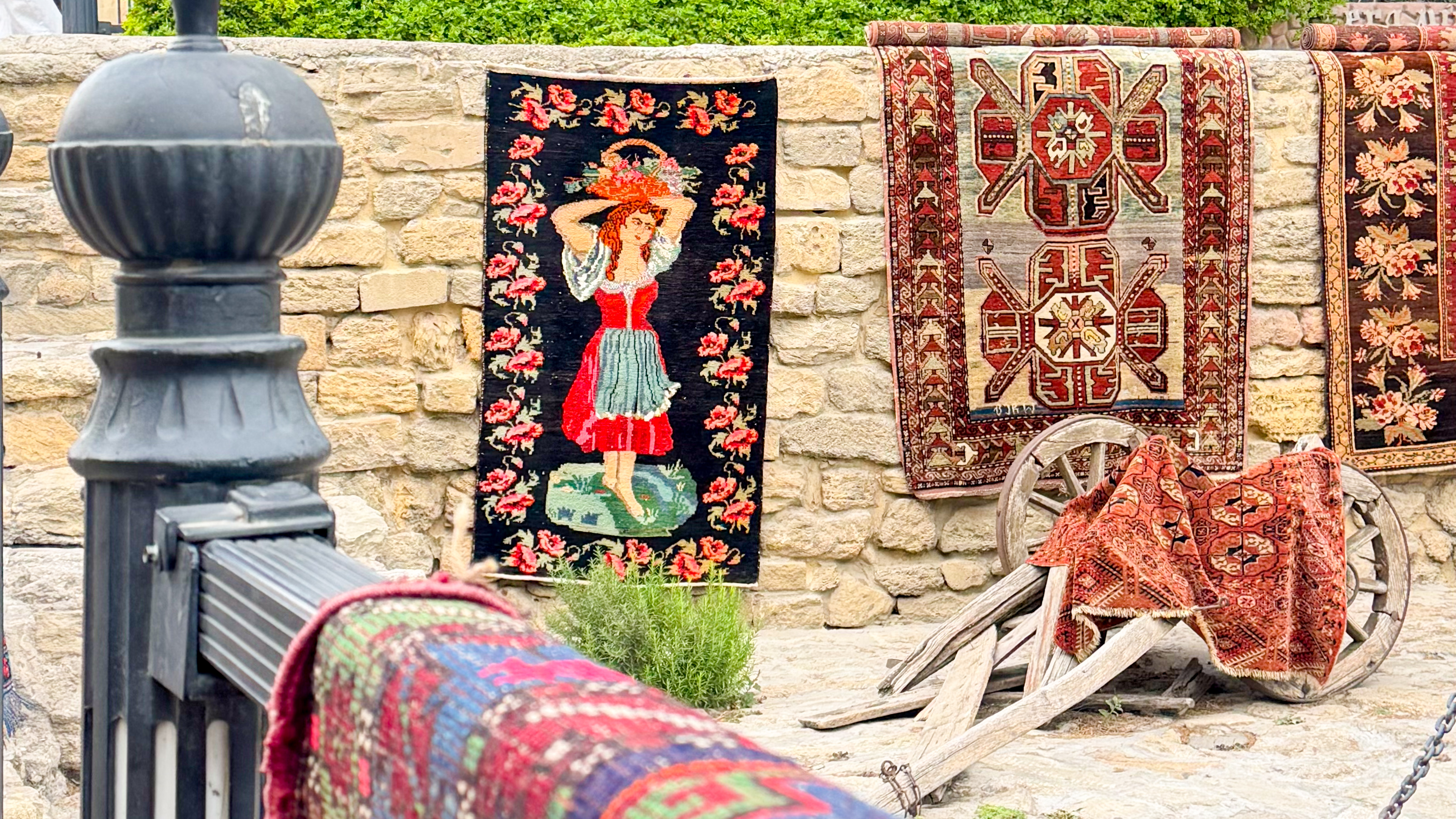 絨毯が有名なアゼルバイジャン、旧市街には絨毯屋さんが多く、店先には色とりどりの絨毯が並んでいます。見ているだけで楽しいし、写真映えも抜群です!