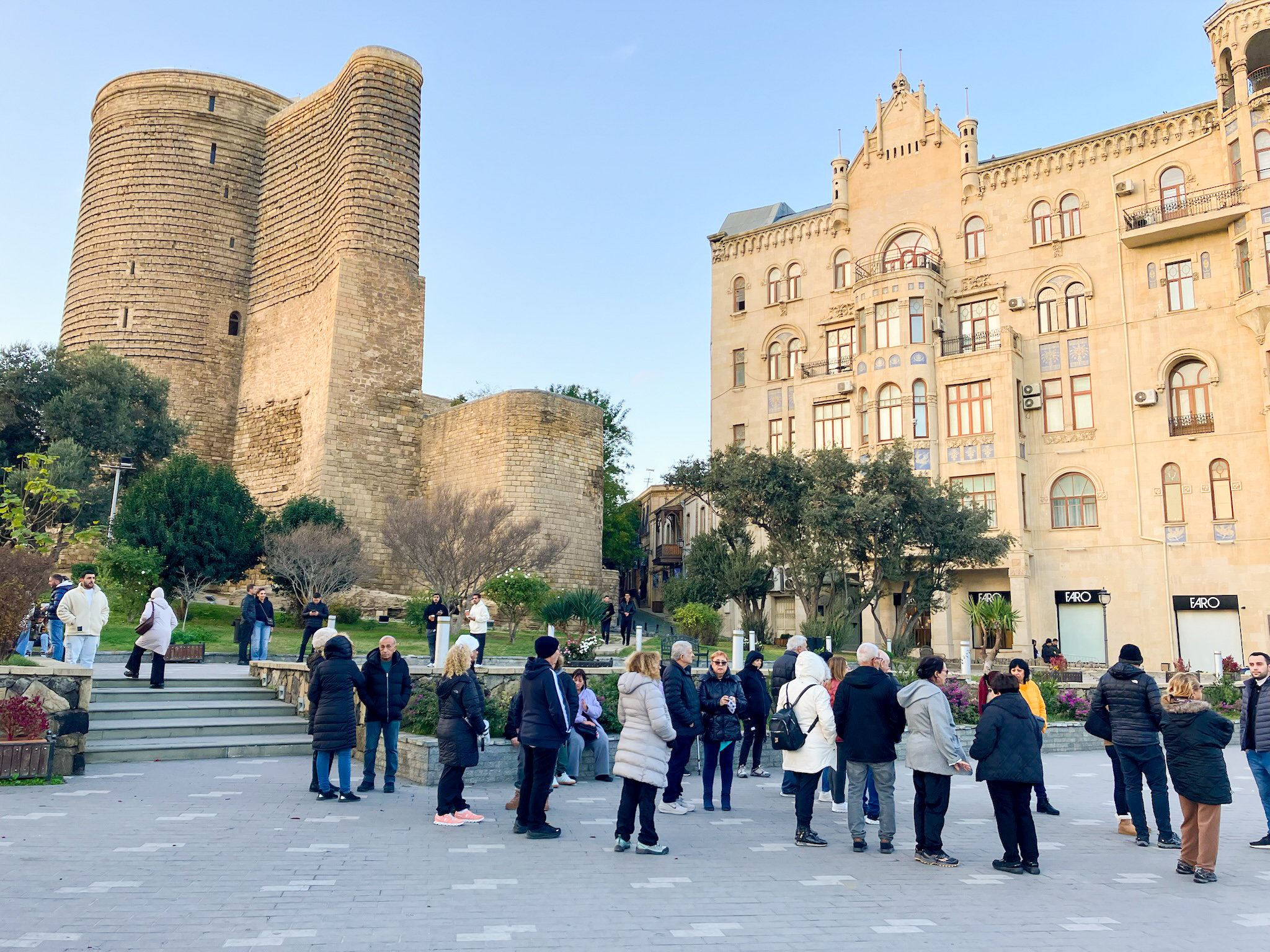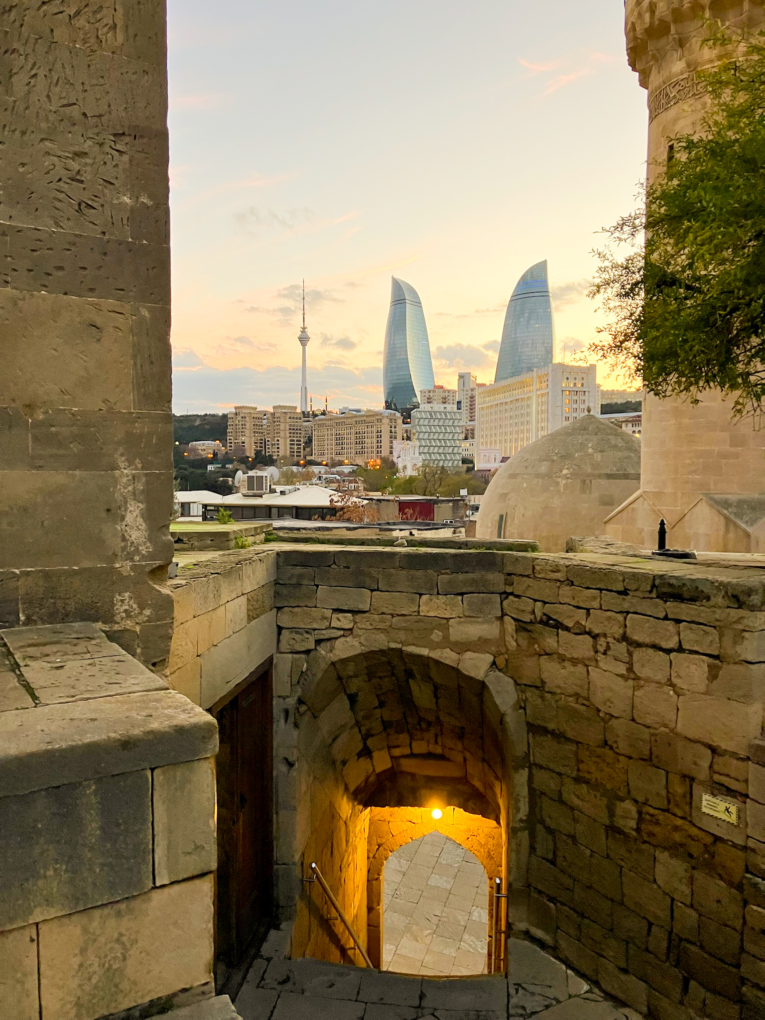 丸い塔の上からは、バクーの街とカスピ海が一望できます。歴史の謎が多い建物で、物語の中に入り込んだような気分になります。